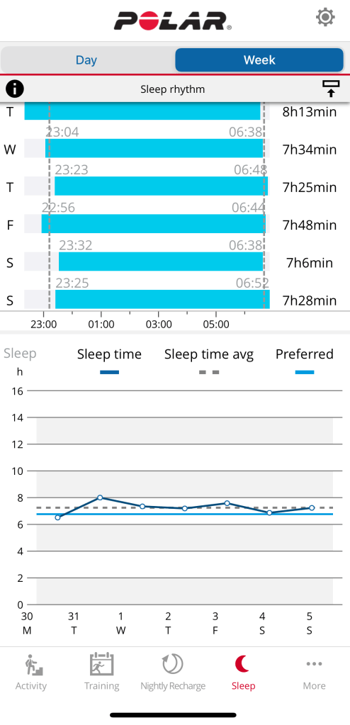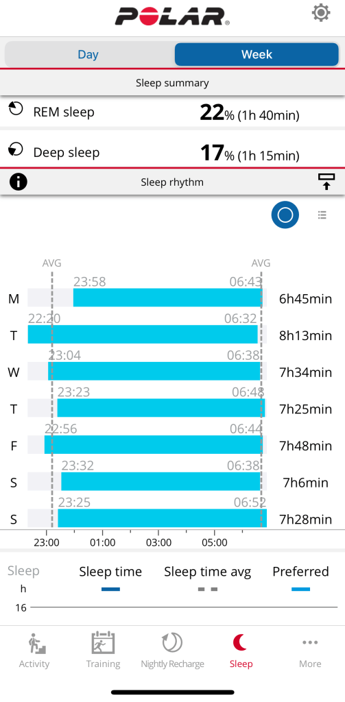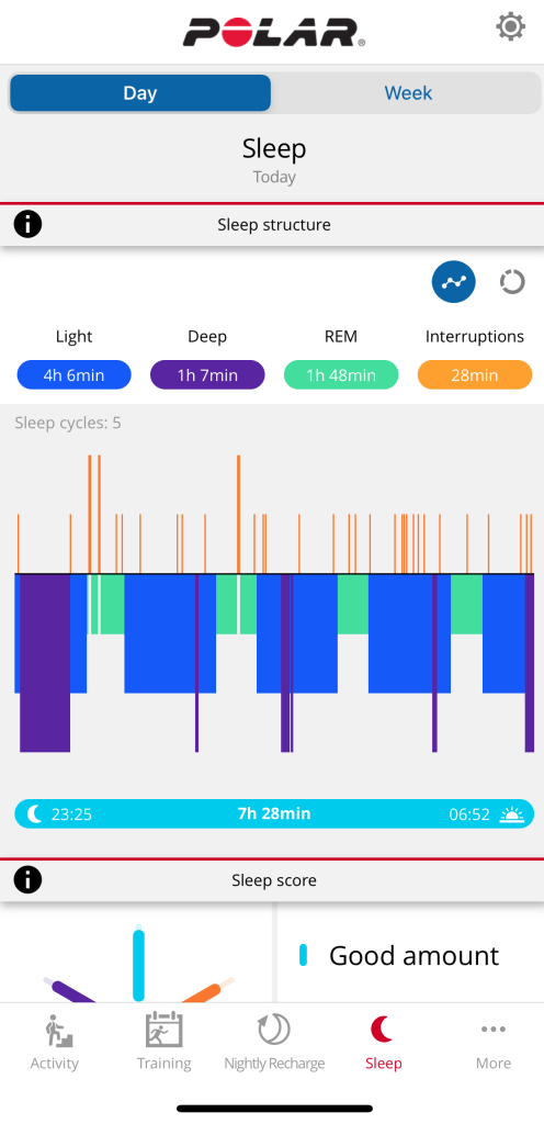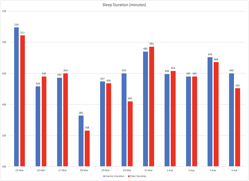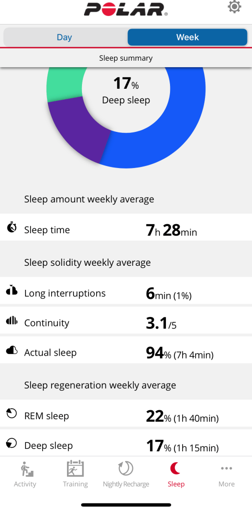 Conclusion – if you’re interested in your sleep analysis, and that’s important for you, Polar does a better job (in my opinion and based on my measurements) than Garmin at measuring your sleep and providing you feedback. Garmin has a more cohesive approach at displaying data in all platforms (watch/mobile/web) but doesn’t do something with the data to help you understand what’s important and how. Polar has developed the algorithms to measure sleep and has some nice stats to display, but also correlated with Nightly Recharge you can act on the data.