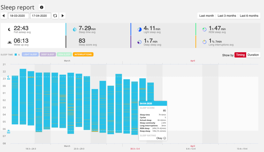 Garmin has extensive reporting in their web app, but the development teams (product teams) are not very in sync, so you’ll get for week/month/6 months/year a graph with your sleep duration but that’s it.