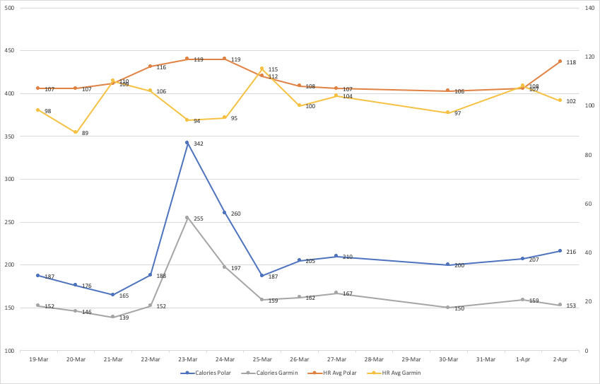 Now, let’s look at other controversial subject – the total number of calories per day reported by the two watches. Usually, Polar reports a higher number.