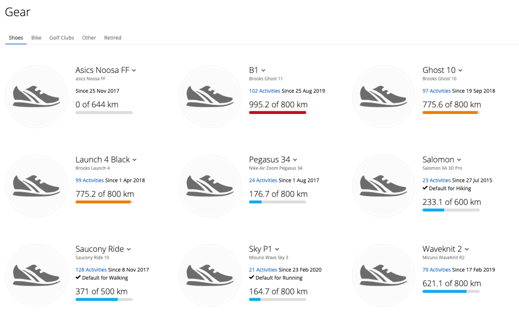 Also, Garmin platforms collects also details about your used gear (be it shoes, bike or something else) and tracks their use in the workouts – it’s nice and useful if you’re interested to know that by the number of km run you should retire some shoes .. you don’t have to act on it, but at least you’ll know that you run with that pair more than 800 km for example.