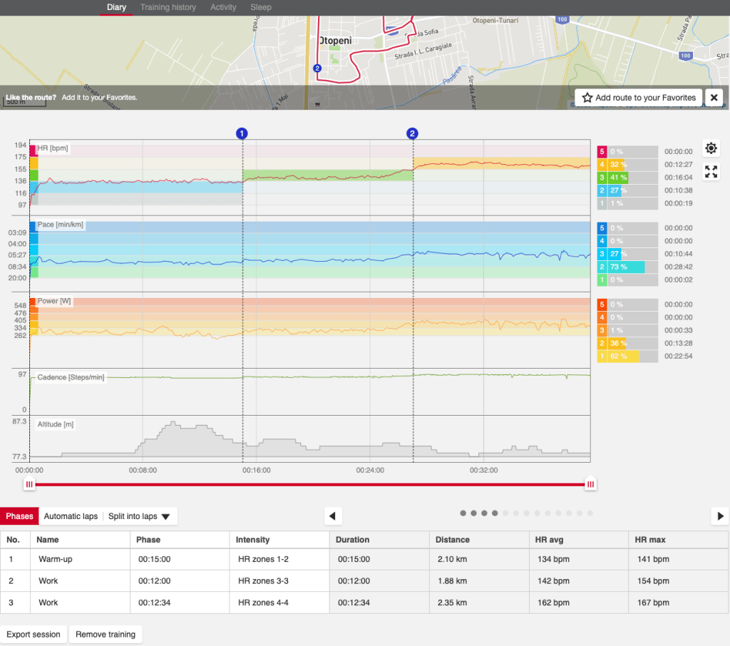 Personally, I like Garmin’s approach more, because Polar’s strict constraints for the phases are not very much helping me, especially since I train on the streets and not on a track, and I care much about the sync between time, distance and where I am from home.