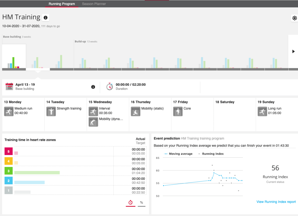 Polar Flow web has also the programs, limited only to running but nice as an interface – allowing planning of your running sessions for the event and mixing those with support activities (which is nice). The programs adjust (a bit) in the early phases based on your execution, but are not that flexible as the coach programs provided by Garmin. Also, the programs provided by Polar are, as expected, only HR based.