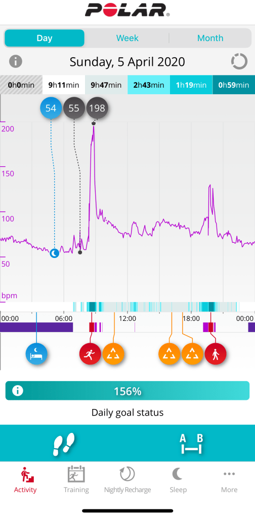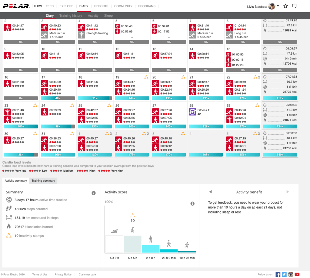 Half of the month I didn’t have daily activity, but only imported the activities from Garmin with RunGap app, but nevertheless the Polar approach is oriented to giving you a dynamic view or trend and not only a snapshot (like Garmin). Garmin offers a very detailed daily snapshot, but doesn’t provide much insight over the evolution (you may access some reports, if you really want) whereas Polar gives you by default a longer term overview of your activity.