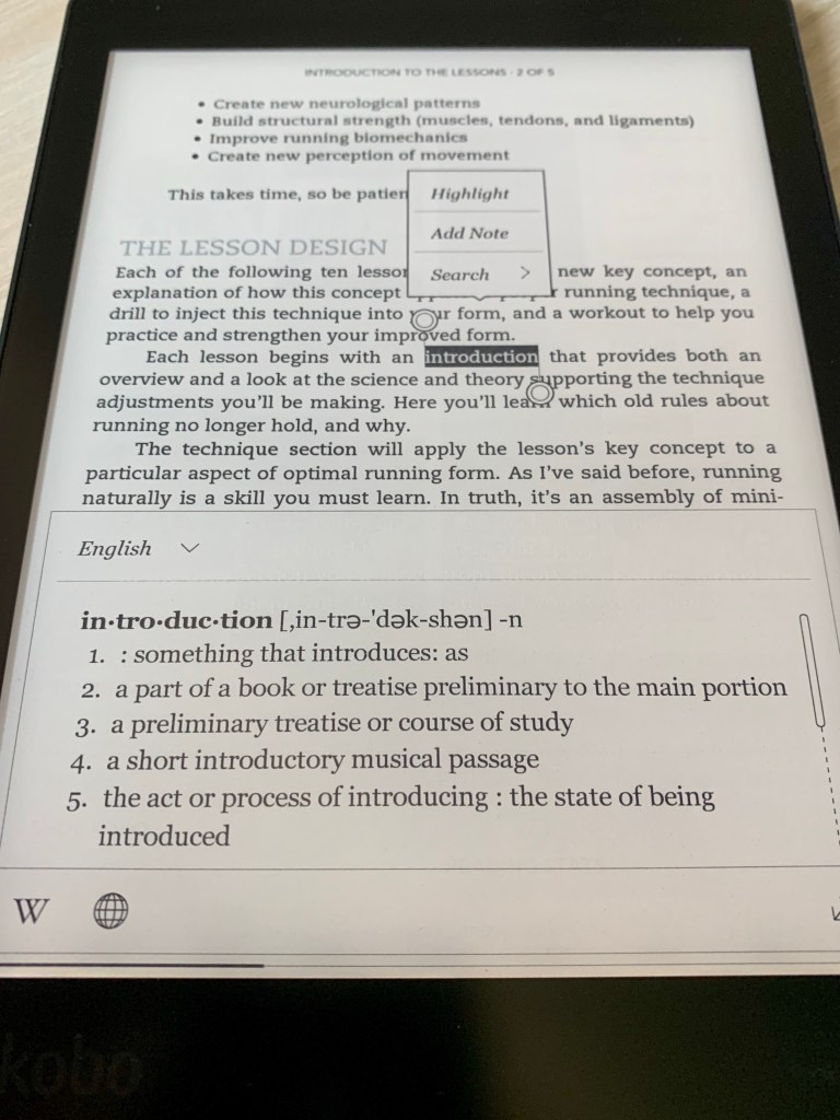 Kobo added in the recent years also the audiobooks in their offering, but that’s not (yet) integrated with the devices, but only available in the shop. That’s a disadvantage compared to Kindle which supports the “Amazon account” with all the goodies and also allows streaming the content from the bluetooth capable Paperwhite (and superior devices). Another weaknesses for Kobo might be considered the English dictionary which is not as capable as Kindle’s is – you may read new books with terms that you won’t find in the dictionary. Yes, you may search online .. but that’s an annoyance you’d like to avoid.