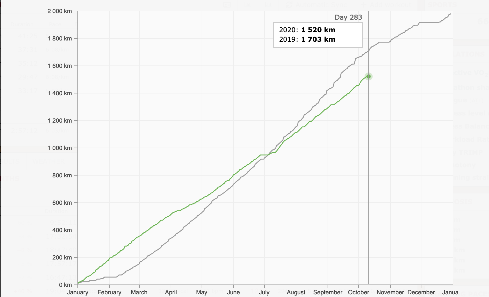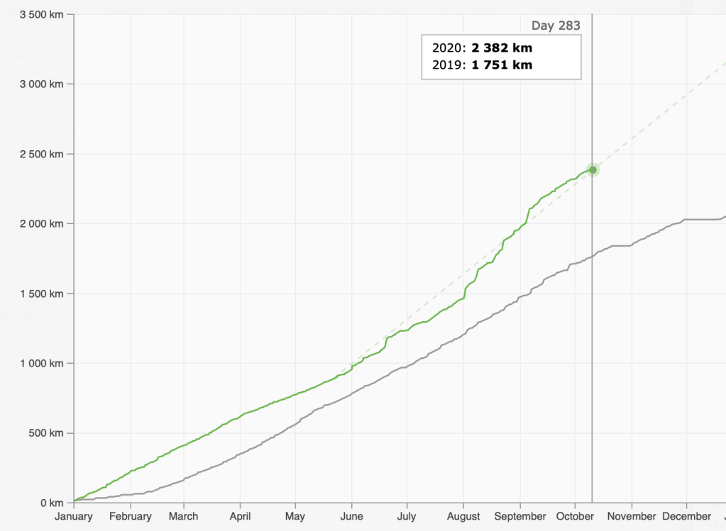 My running fitness level is lower now when compared with the same period of 2019, but then it’s understandable since last year during this period I was training for a marathon, in 2020 I only run twice a half-marathon distance and after March the longest run was 13.3 km. Looking back, I’d say that the competition motivation in 2019 was replaced by a being healthy kind of motivation. I allowed myself to run at a lower pace, lower HR, try new approaches and stress myself less.