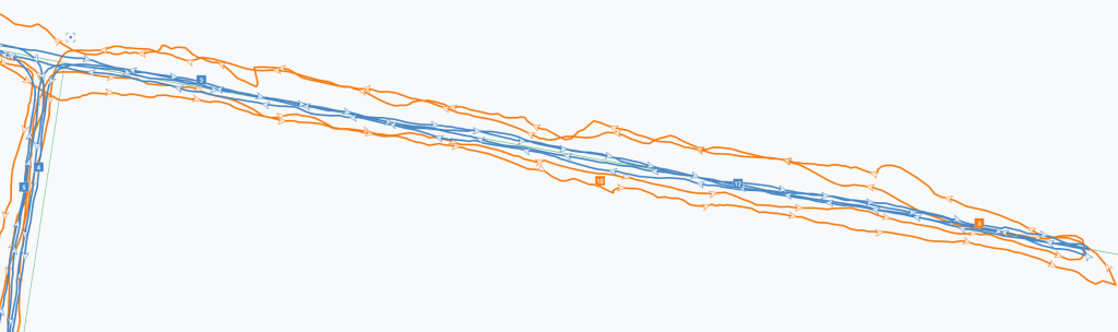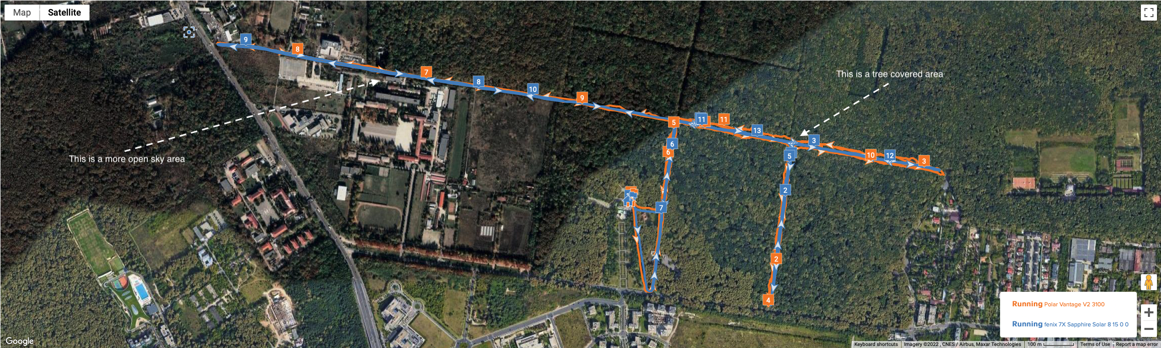 My track has two sides – the left side is more open sky whereas the right side is under the tree cover – that makes a difference when you zoom into those areas – on the left side, the difference is not consistent, it might be interpreted as being the result I worn the watches on different arms; on the right side, the difference is more clear – Fenix 7X with dual-frequency dual band GNSS is able to keep the straight line and Vantage V2 wonders around during both passes through that zone.