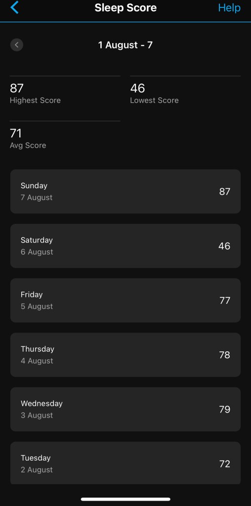 Garmin takes into account for the HRV over night as well so yesterday’s score for Garmin is 46 and that’s well reflected in the Nightly Recharge in Polar, but not in the Sleep Score.