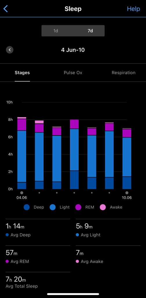 Looking at the numbers for several days, Garmin is more generous with Deep Sleep and less with REM, but in terms of duration and general info they don’t look that different [that doesn’t say that Garmin is ace in this area] – usually they both are accurate in detecting the start and end moments of sleep at least. What Garmin (with FirstBeat) does and I was expecting Watch OS 10 to do as well (but didn’t at least during the WWDC announcement) is giving you an interpretation or score of the sleep and some indications for the day. Otherwise the data is there (and it might be accurate) but won’t be used easily by the large mass of users. I understand Apple’s reluctance to commit to advice or categorical statements, but still ..