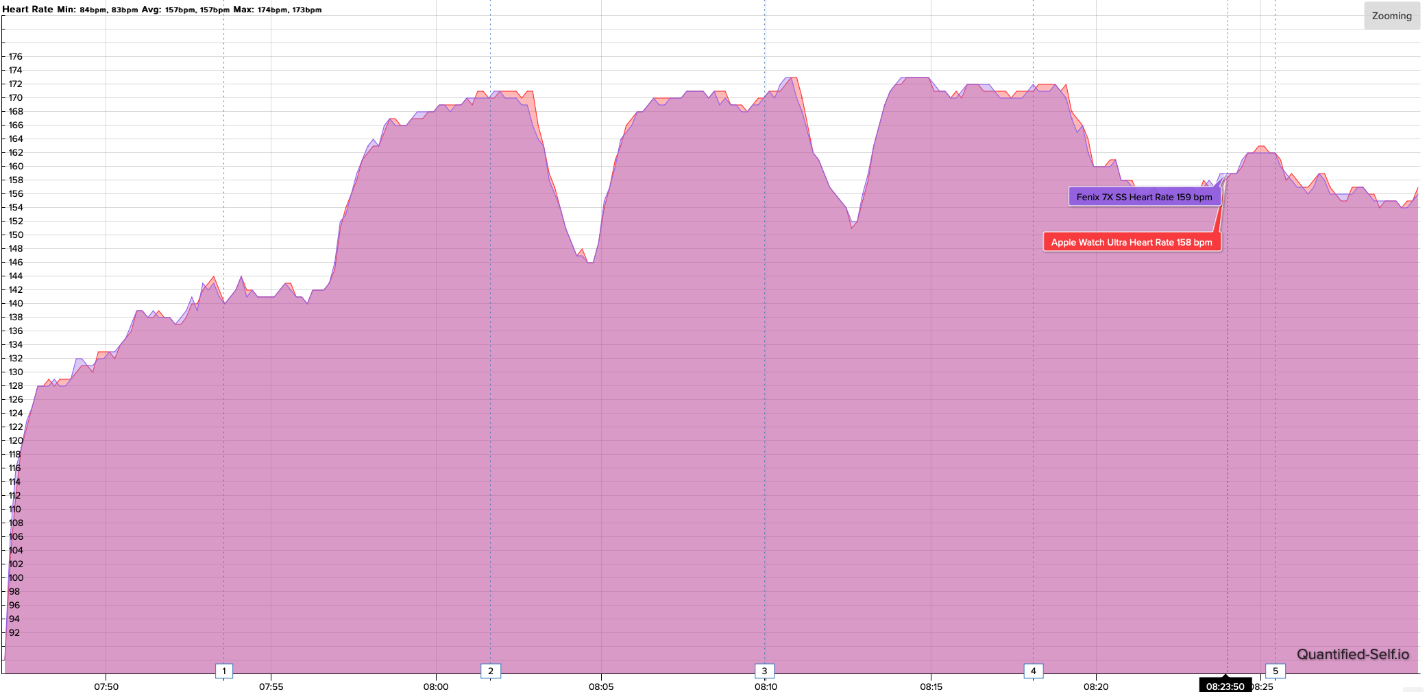 HR accuracy – the accuracy of the Apple optical HR sensor was praised by various people and I confirm that it’s fine, though I’m not that impressed with it’s consistency to consider it a replacement for the Polar H10 or even the Polar Verity Sense I used with my Fenix so far. I mean, for a heavier watch you’d expect that the vibrations will affect the accuracy of the sensors and for example with Fenix I decided to wear either the H10 or the Verity Sense. To some extend the same applies to Apple Watch Ultra – most of the time is ok, but if you really care about measuring HR during the higher intensity workouts, take one external sensor. I had some situations when the sensor was just struggling to get the HR, the intensity was low .. I suspect the sweat to be a factor, but that’s just expected during a workout. This may affect your overall “measured intensity” depending on the value the watch “locked” and the duration of the “lock”.