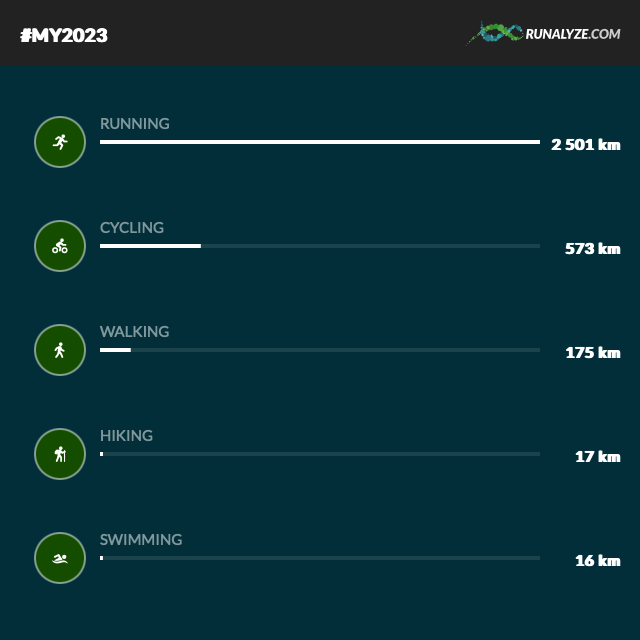 If you compare that to 2022, there are small differences (positive ones) in 2023 for running and cycling, not that much hiking and walking .. but overall, I was still more time active than in 2022, which says something about the determination to be active and healthy.