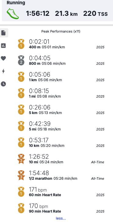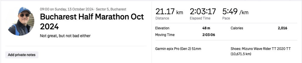 If you take into account the fact that my weight since October 2024 increased with 2.5kg, but I managed to shave some good 8 minutes from my previous attempt of HM, you can consider that I’m on track to improve, considering that I’ll loose some weight, add some more (all) strength training and maintain the dedication to running.