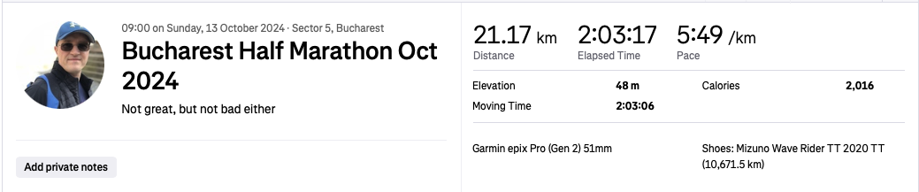 The result .. a good one, considering the situation .. way better than 6 months ago. But the result is not the most important aspect of the race .. it was more about the resilience to continue to do what I’ve came to do, no matter the difficulties and the temptation to let it go. For example, when I was approaching 11km and I was close to home, I thought about quitting … it wasn’t an “official” race, nobody was there to see me and cheer me up, I could just go home since the weather was miserable and was just getting worse…For 200 meters my mind was just thinking that I won’t be closer to home than now .. why all the pain, why all the suffering [the chaffing with soaking clothes is just magnificent]. But I didn’t, this (quitting) was not what I was training for .. if you can do it, you’ll do it.