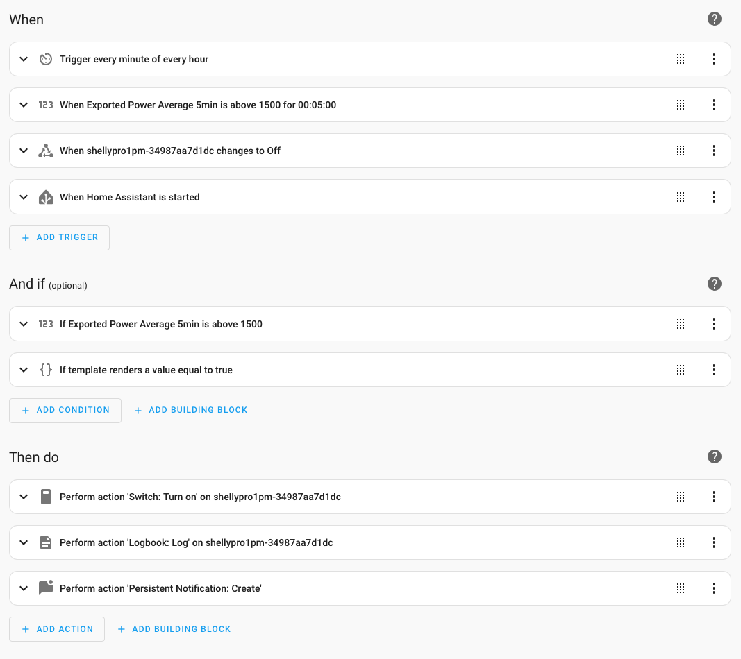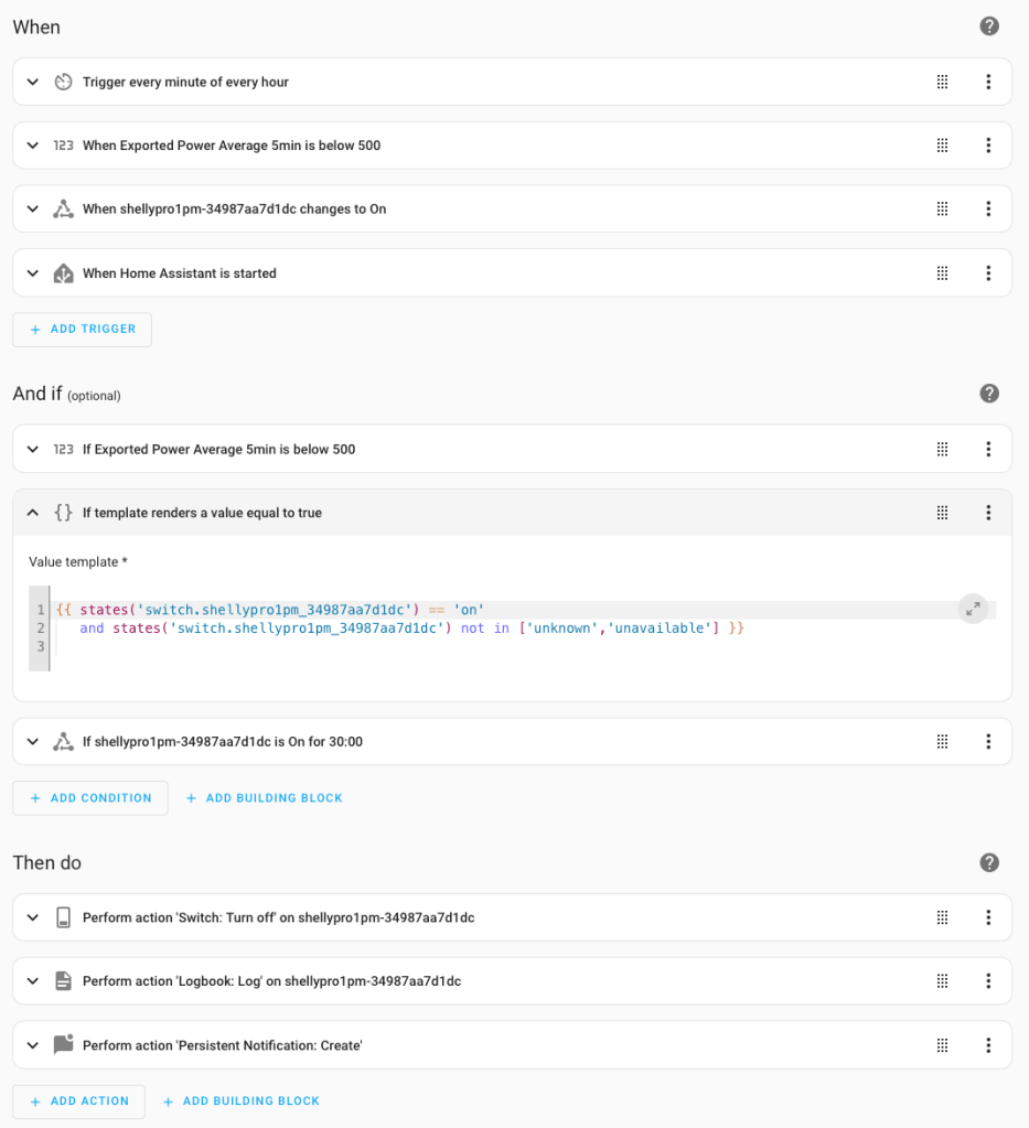 For the OFF automation, the logic is similar structurally, with the main difference that even if the exported energy goes below 500W, you won’t turn off the shelly unless it was powered on for 30 minutes to avoid the self-close. That covers the scenario when you start the shelly when the export was 2100W for the last 5 minutes, the electric heater starts and consumes 2000W, then in less than 5 minutes you’d go below 500W and the shelly would go off, which may put a lot of pressure on the shelly and the electric heater.