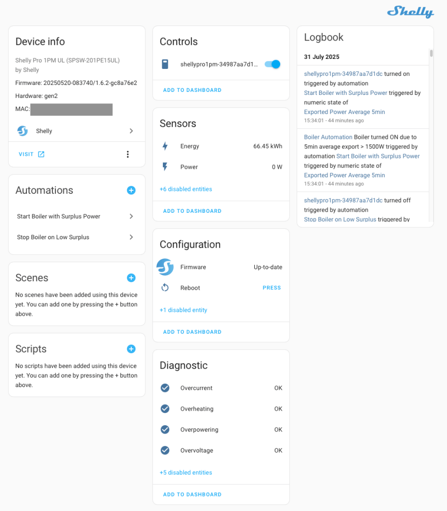 OK, so now .. let’s loot at the automation problem – instead of a programable socket you can go for a Shelly Switch (Shelly Pro 1PM with 16A output is good enough for my setup and has plenty of connectivity capability – https://www.shelly.com/products/shelly-pro-1pm) which allows you to create a smarter automation. Add to that Home Assistant (https://www.home-assistant.io) an open source solution for home automation which can offer out of the box connections to inverters, smart devices and is well maintained.