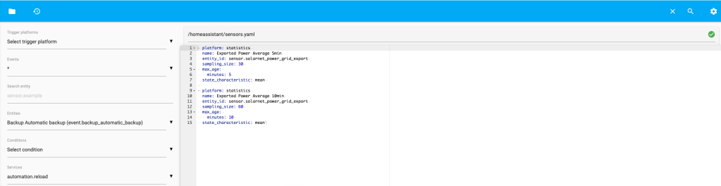 That power excedent shouldn’t be just for a moment in time, but rather a consistent behaviour, so I defined two sensors which are based on the exported power – the average for 5 minutes respectively for 10 minutes – which are not perfect proxies for the solar behaviour, but at least you don’t play with ON/OFF just by the move of some small cloud.