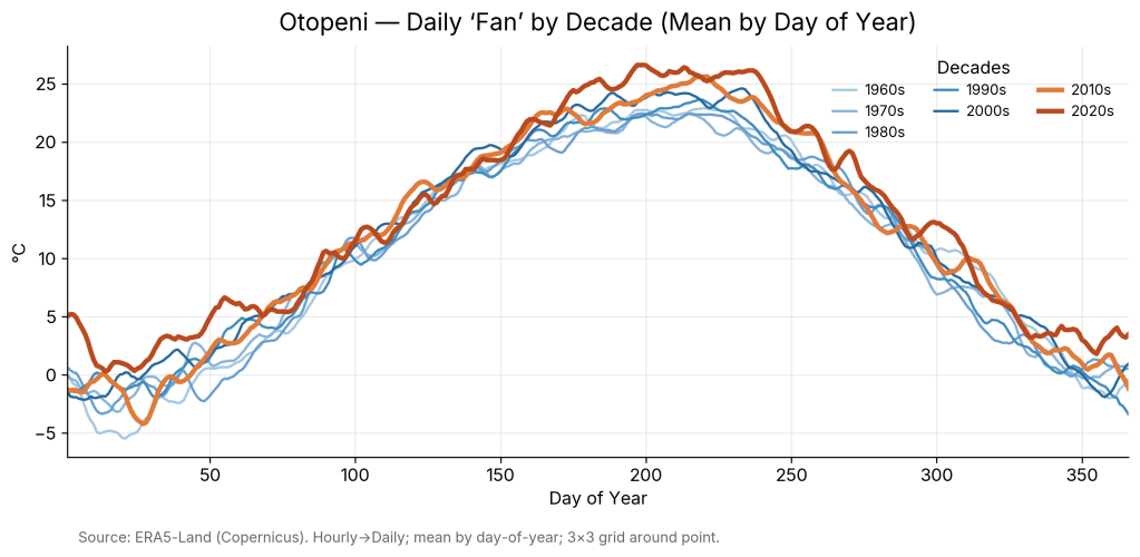 The decade-by-decade averages confirm what memory suggested: summers in the 1960s, 70s, and 80s were noticeably cooler. In both the monthly means and the daily “fan” charts, you see a clear upward shift over time.