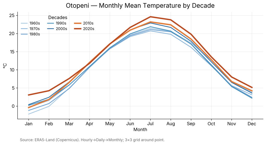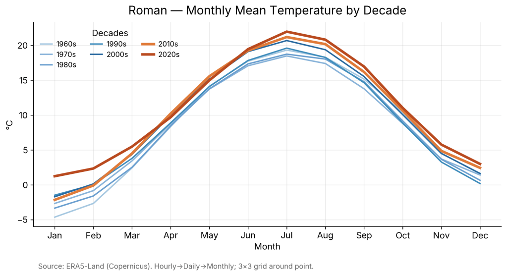 In Otopeni, the shift isn’t gradual — it’s obvious. The monthly profiles for the 1960s–1990s hug close together, forming a baseline of “old” summers. Then, starting in the 2000s, the whole curve lifts. By the 2010s and 2020s, July and August are a full 2–3 °C hotter than the climate I grew up with in Roman.