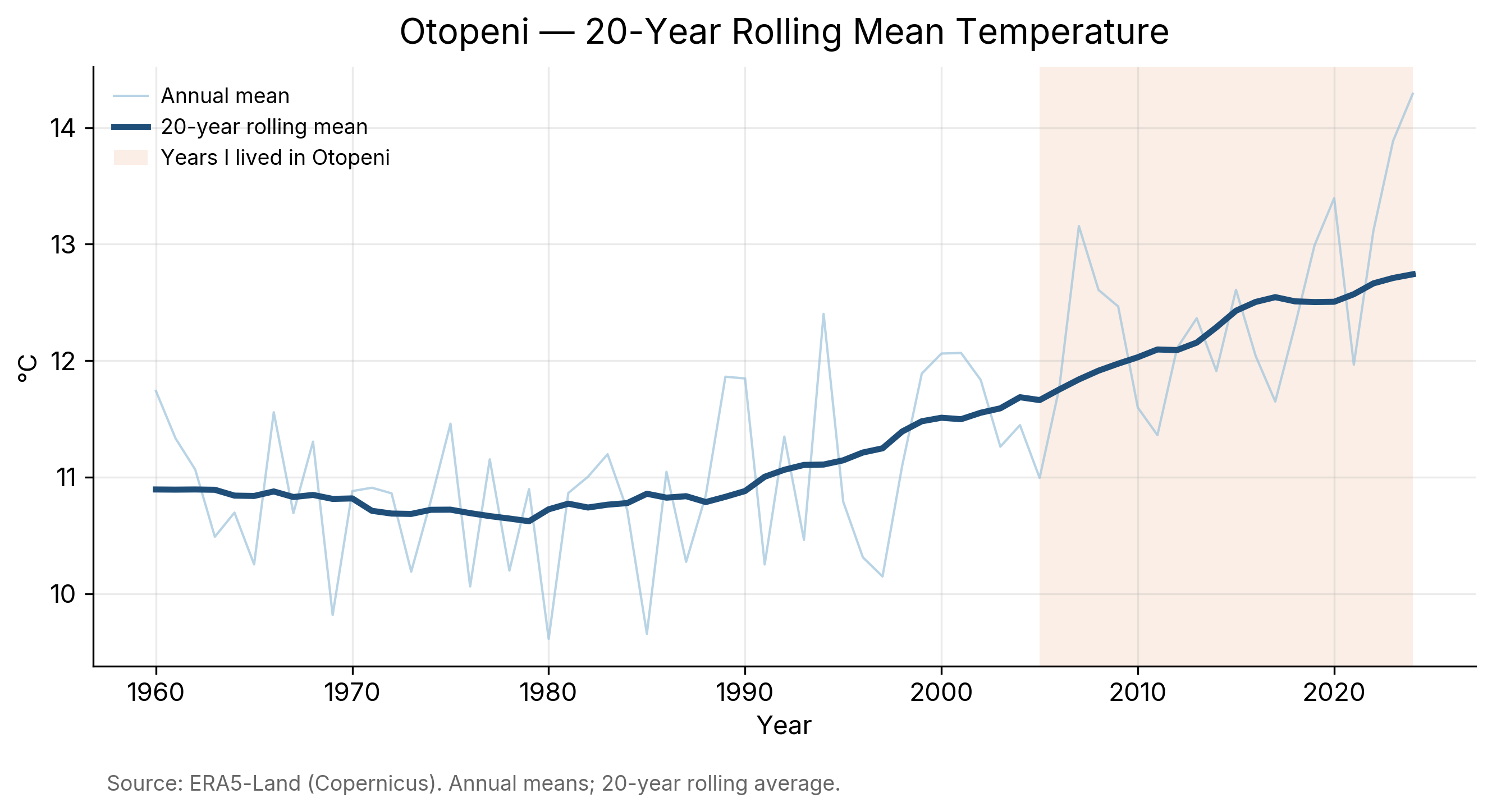 The rolling 20-year mean ties this to lived experience: when I moved to Otopeni in 2005, I entered the steepest part of the curve. My adult years have overlapped precisely with Romania’s fastest period of warming.