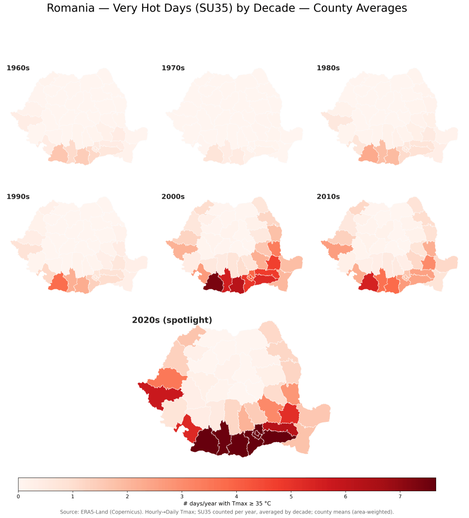 - 2020s spotlight: The acceleration is undeniable. The southern half of the country now routinely sees 6–7 very hot days per year, with some counties flirting with even higher averages. What was once exceptional is fast becoming a new normal in large parts of Romania.