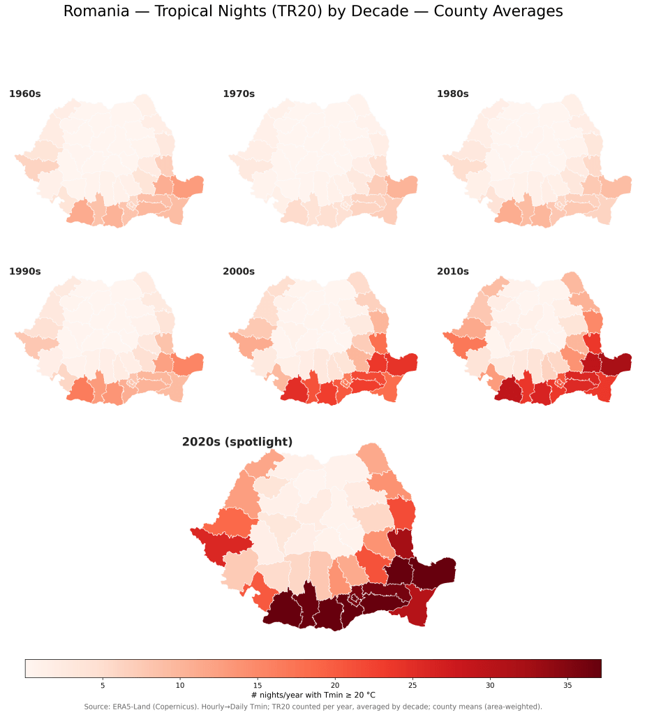 By the 2010s, tropical nights were no longer an anomaly but a regular summer feature in much of the country. And in the 2020s, the spotlight map makes the shift unmistakable: large areas of southern and southeastern Romania now average more than 30 tropical nights per year — effectively an entire month of nights too hot for natural nighttime cooling.