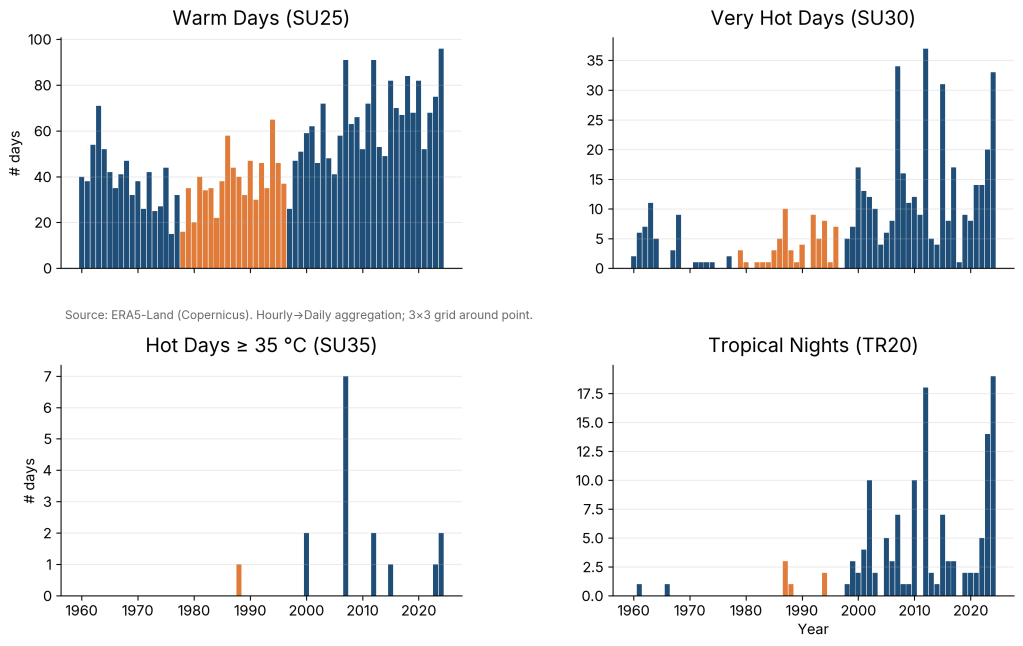 - Warm days (≥25 °C) have roughly doubled in frequency since the 1980s.