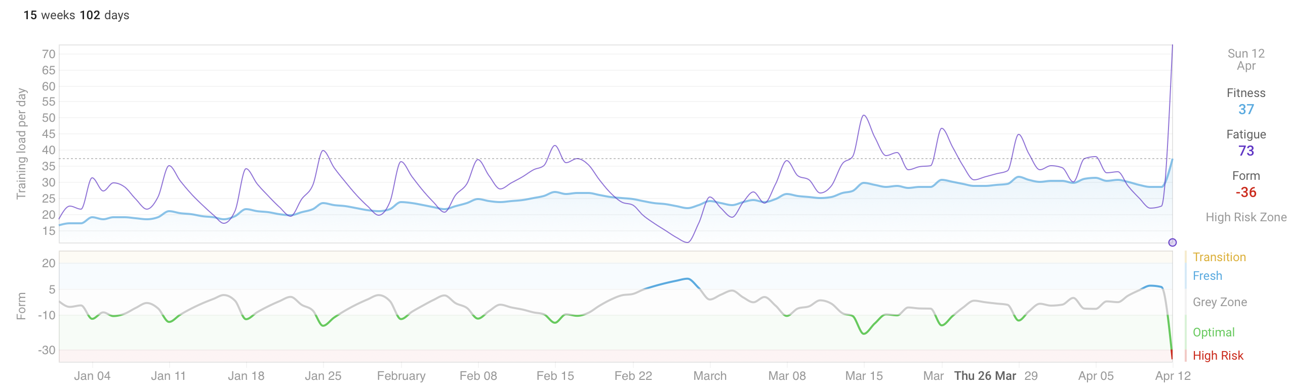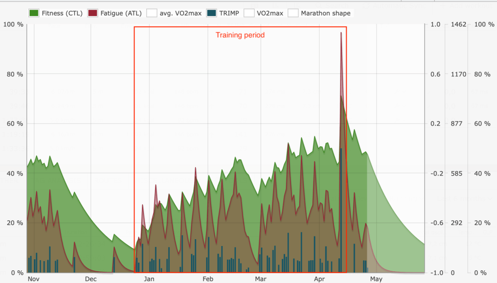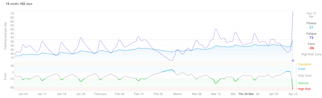 By the end of race day, my form had dropped to -36. Deep in the high-risk zone, which seems appropriate after asking an undertrained body to cover 42 kilometers.