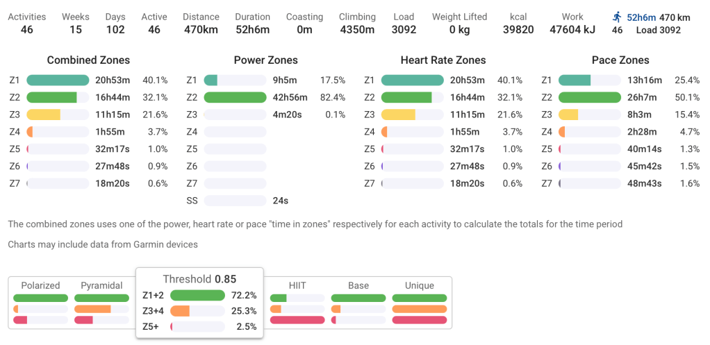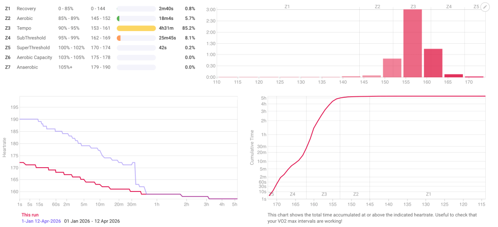 Looking at the data afterwards, over 90% of my power output during the preparation sat in Zone 2. Easy aerobic running, almost exclusively. That explains part of why I could stay calm and keep moving. It also explains why the race became expensive muscularly in the second half.